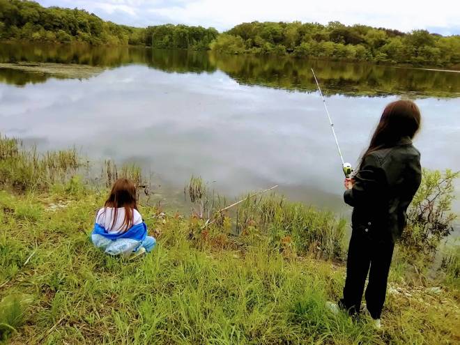 She played the snag the grass game for a while, but after some practice she was able to make her line sail into the water with a plop. I chased after my son who had just learned to walk and was always testing his boundaries when my husband shouted, “We got one!”