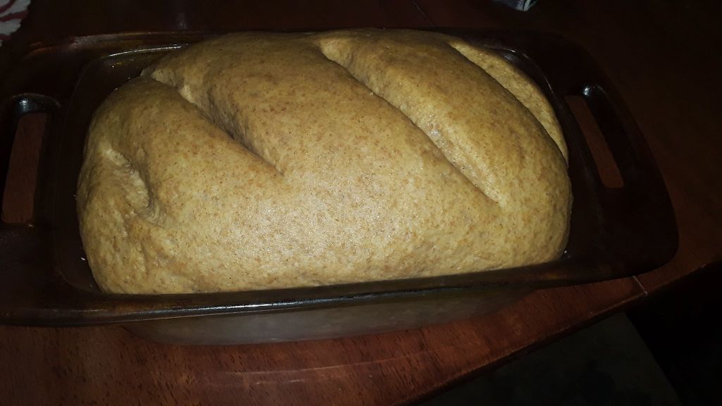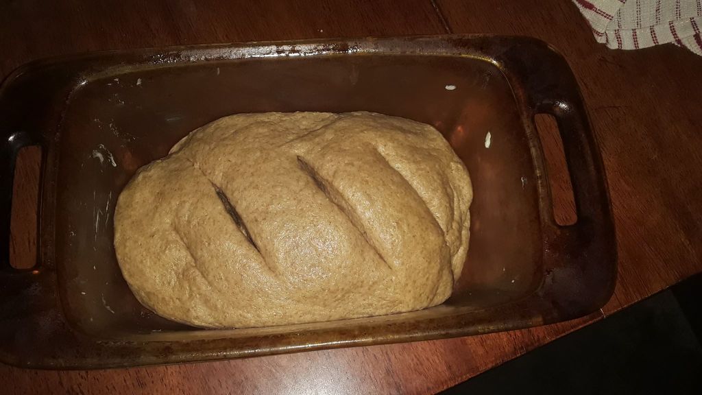 Once it rises you need to take it out of the bowl and punch it around a bit. Some people call this “kneading” I call it stress relief. But once you do that then you form it and put it in the loaf pan, but it’s NOT time to bake it yet haha Not unless you like dense bread. Gotta let it rise again. But you can cut a few slits or holes, or make pictures on top to allow better airflow for when it is time to bake.