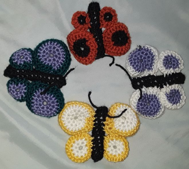 These cuties are great alone or in groups and can be fun decorations or toys. The wings can be solid, but I prefer to switch colors in the middle of each section to offer a more vibrant effect.