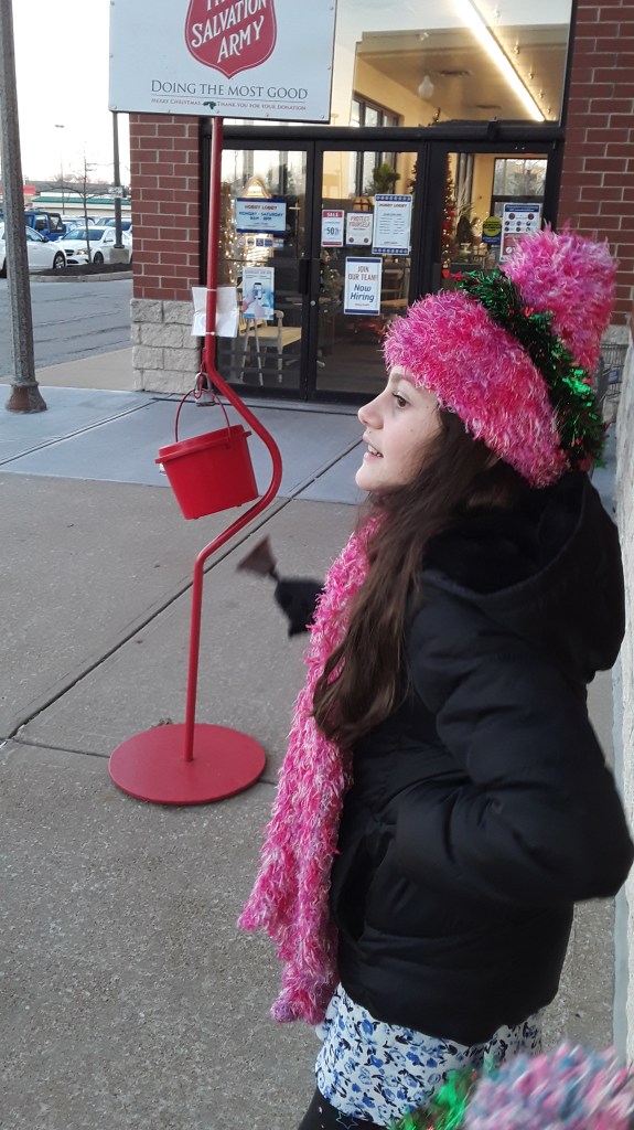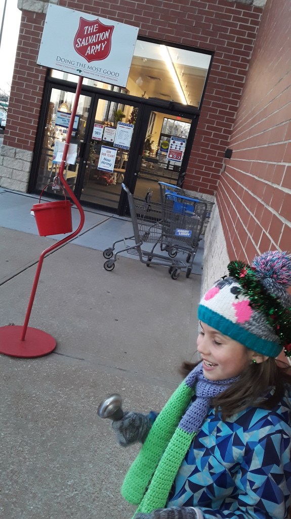 My eldest daughter has been having a rough go missing her friends throughout this year, and I’ve been missing some of our regular volunteer work since I had my youngest and our favorite animal shelter is running at low capacity due to covid. So we signed up for a bell ringing shift through the Salvation Army.