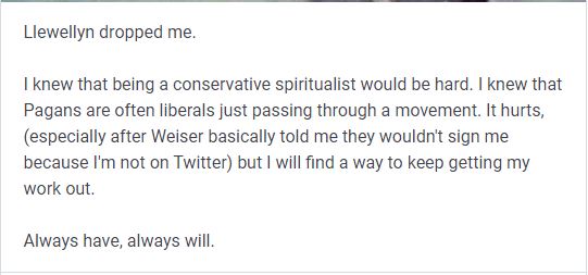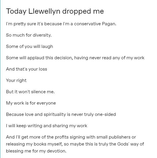 My book sales only went up when I left mainstream social media, but because I do not hide who I am and believe in diversity of thought above all, suddenly Llewellyn is claiming that my title with them, didn’t sell enough. (This is the book with sales that my editor raved about for months).