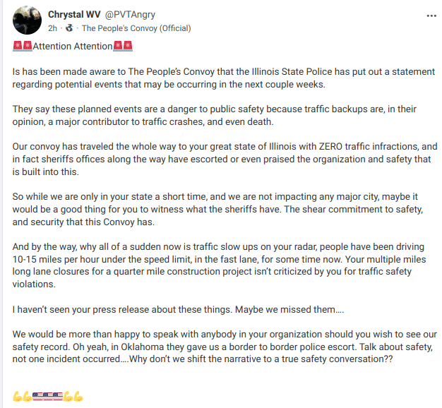 The People’s Convoy Updates 2-27-22 Posted on February 27, 2022 by JessicaMarieBaumgartner Posted in communication, culture, current events, information, news, nonfictionTagged american truckers, americans, by the people and for the people, convoy, convoy information, convoy routes, convoy updates, current events, freedom, freedom truckers, human rights, liberty, life, medical choice, medical rights, news, nonficition, oklahoma, on the road again, peaceful protest, peoples convoy, power in the people, pursuit of happiness, routes videos, the people's convoy, truckers for freedom, truth, updates Today’s Schedule: https://t.me/richardcitizenjournalist/5168 https://www.youtube.com/watch?v=eUFleNI3_vk&feature=youtu.be Share this: Click to share on X (Opens in new window) X Click to share on Facebook (Opens in new window) Facebook Like Loading... Related