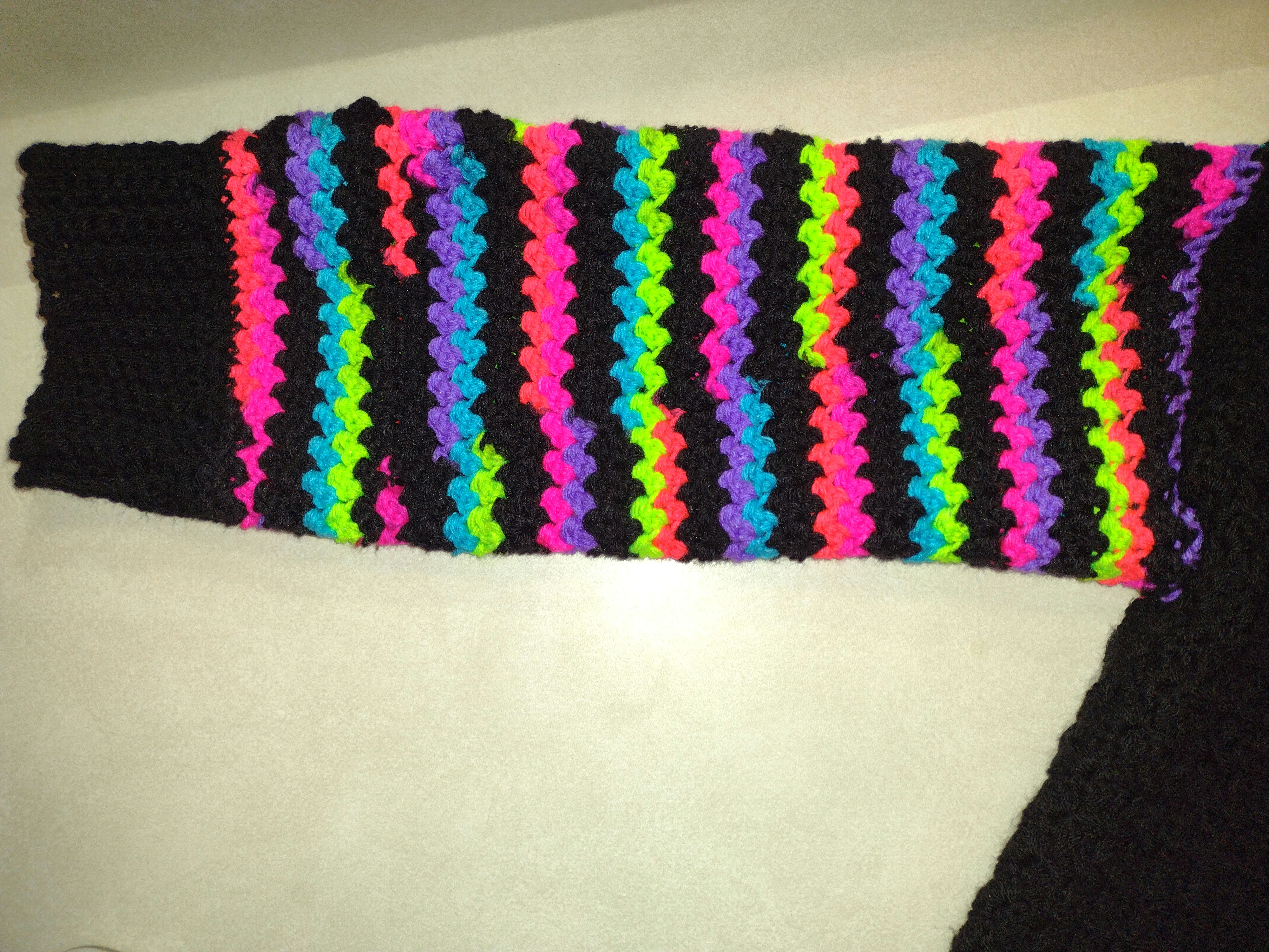 Next Rows: Repeat around and around and around until the arms measure just up to your wrist. Make them as long or short as desired, but remember to leave some room for the cuffs.