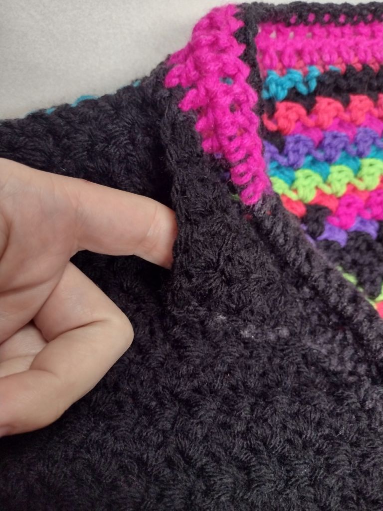 Row 1: Slip st to join at the bottom of the opening left for the arms. Work sc in each st around passing the shoulders and going back down to the bottom.
