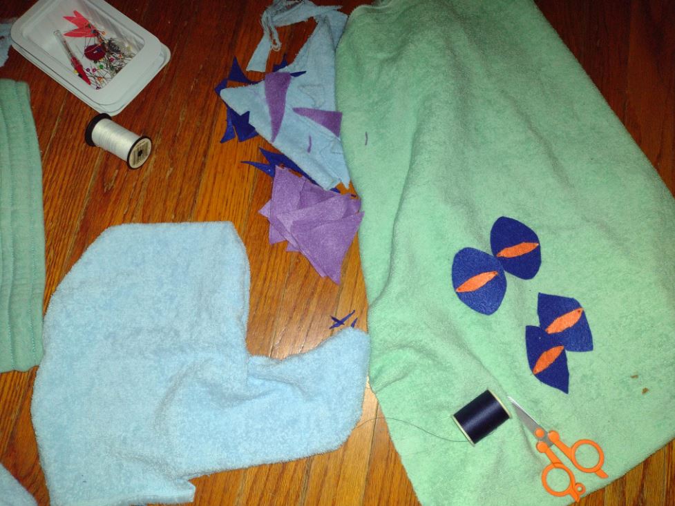 The next morning, I was determined to finish! Sewing the heads onto the body piece took some time. I pinned it while my daughter wore it and took care to sew the heads to the sides of the hood to make sure they sat up and looked ahead properly.