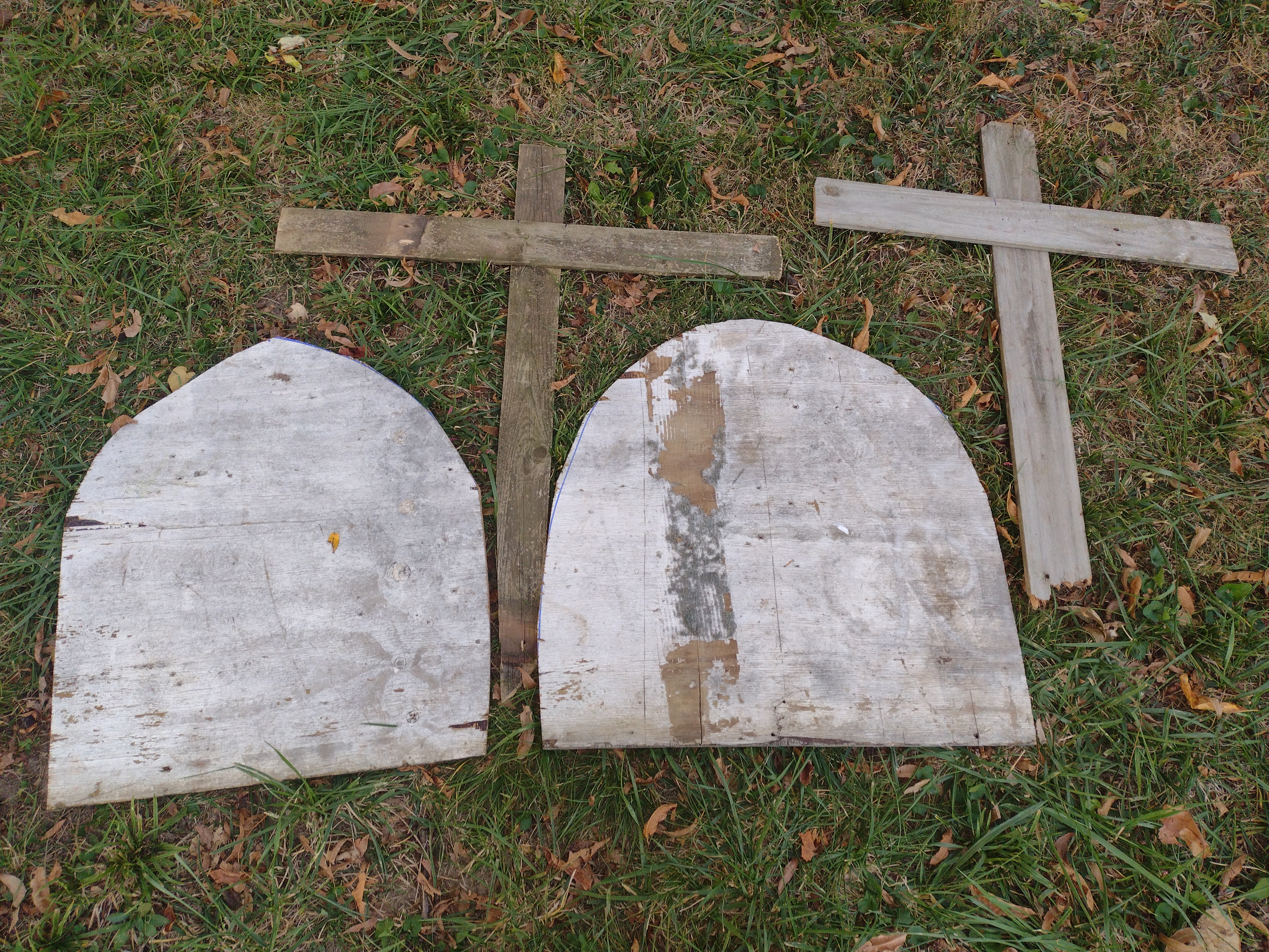 I also like pretending to be Amish. I don’t like power cords or batteries made with materials mined by slaves, so I got out Ye Olde Handsaw and carved me up a couple of headstone shapes. It’s harder than it looks. Lots of triangles come into play when cutting a curve with a plain old saw.