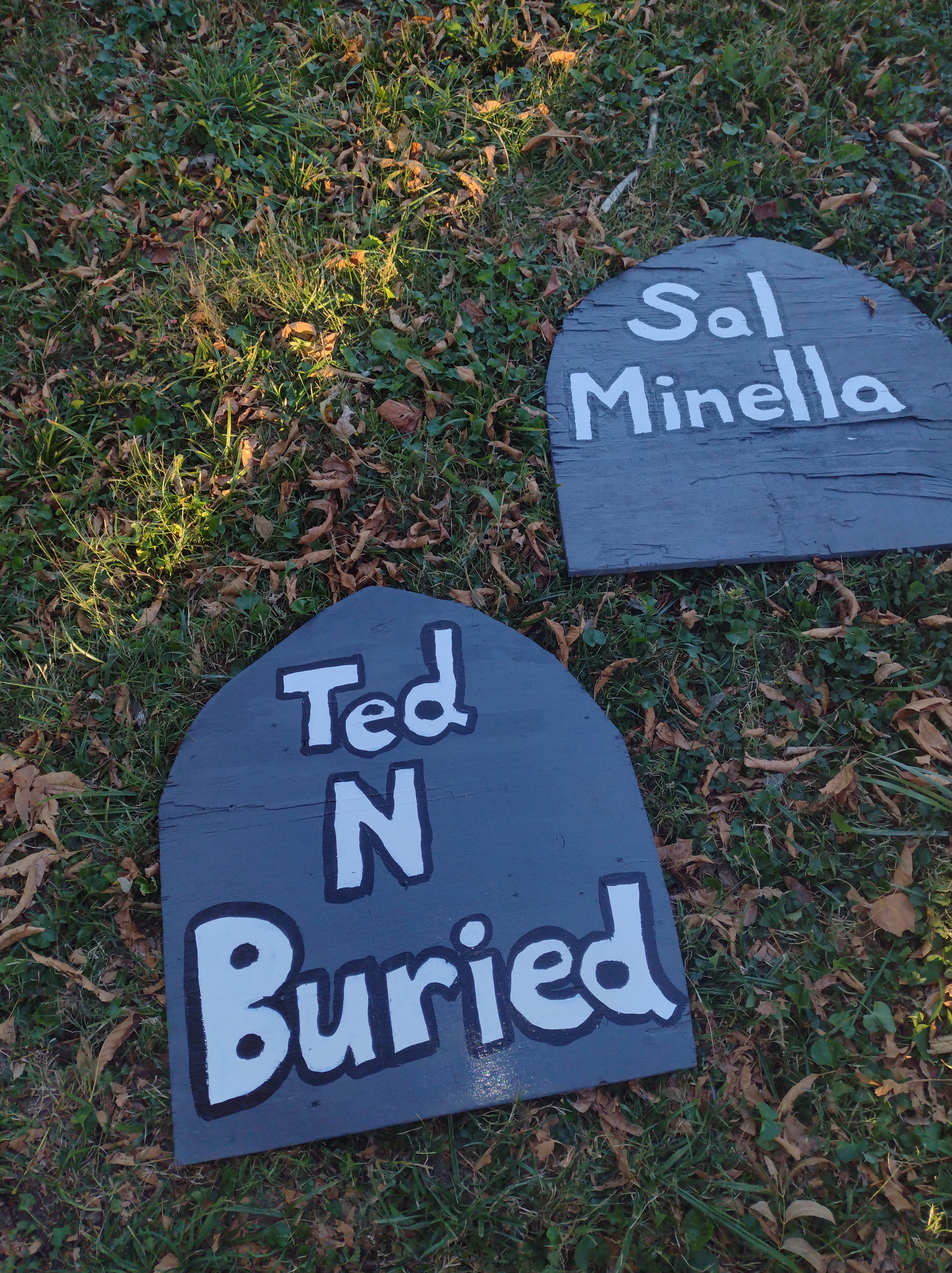 I hammered in some boards to the back of the rounded headstones to make them stand up, and now we have our creepy graveyard, ready for all the Halloween thrills!