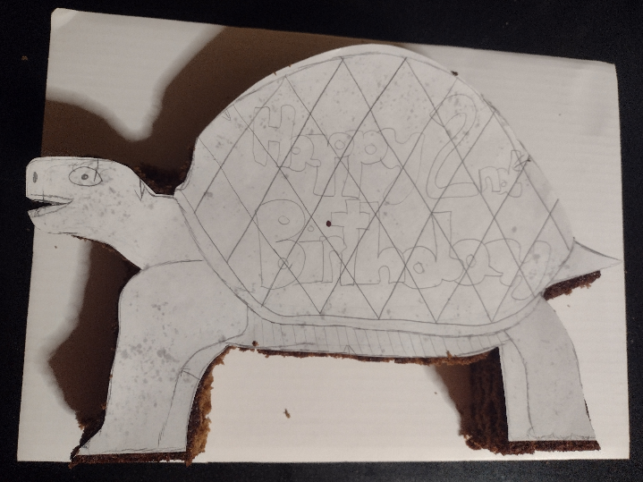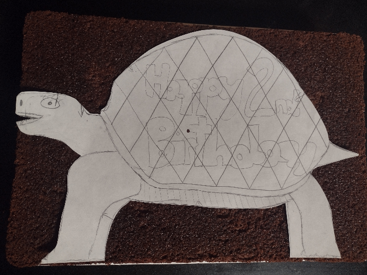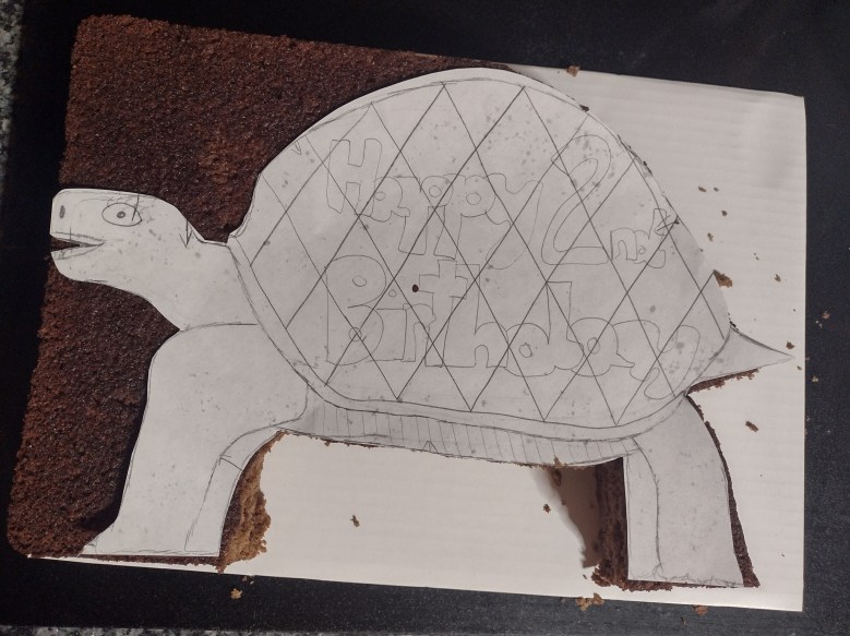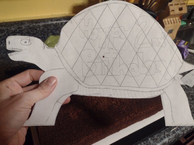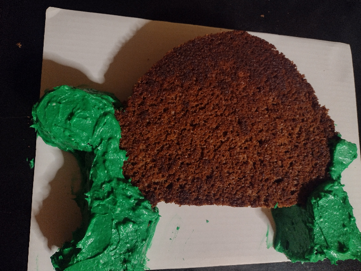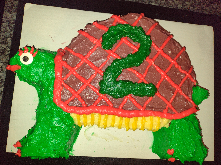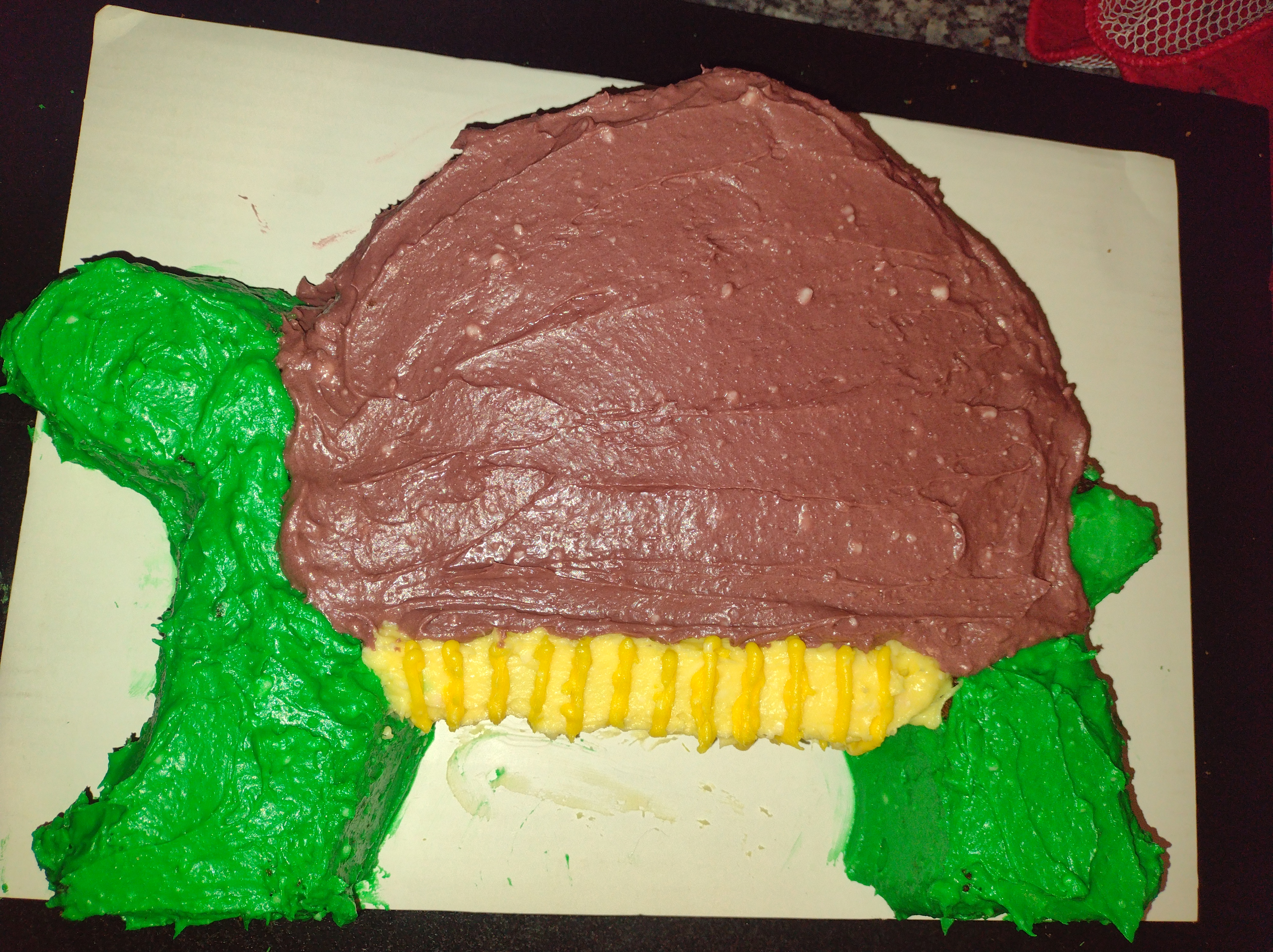 Icing the shell was weird but satisfying. My older girls joked that the ugly greyish brownish purple looked more like a real turtle shell and begged to eat all the leftover cake and icing.