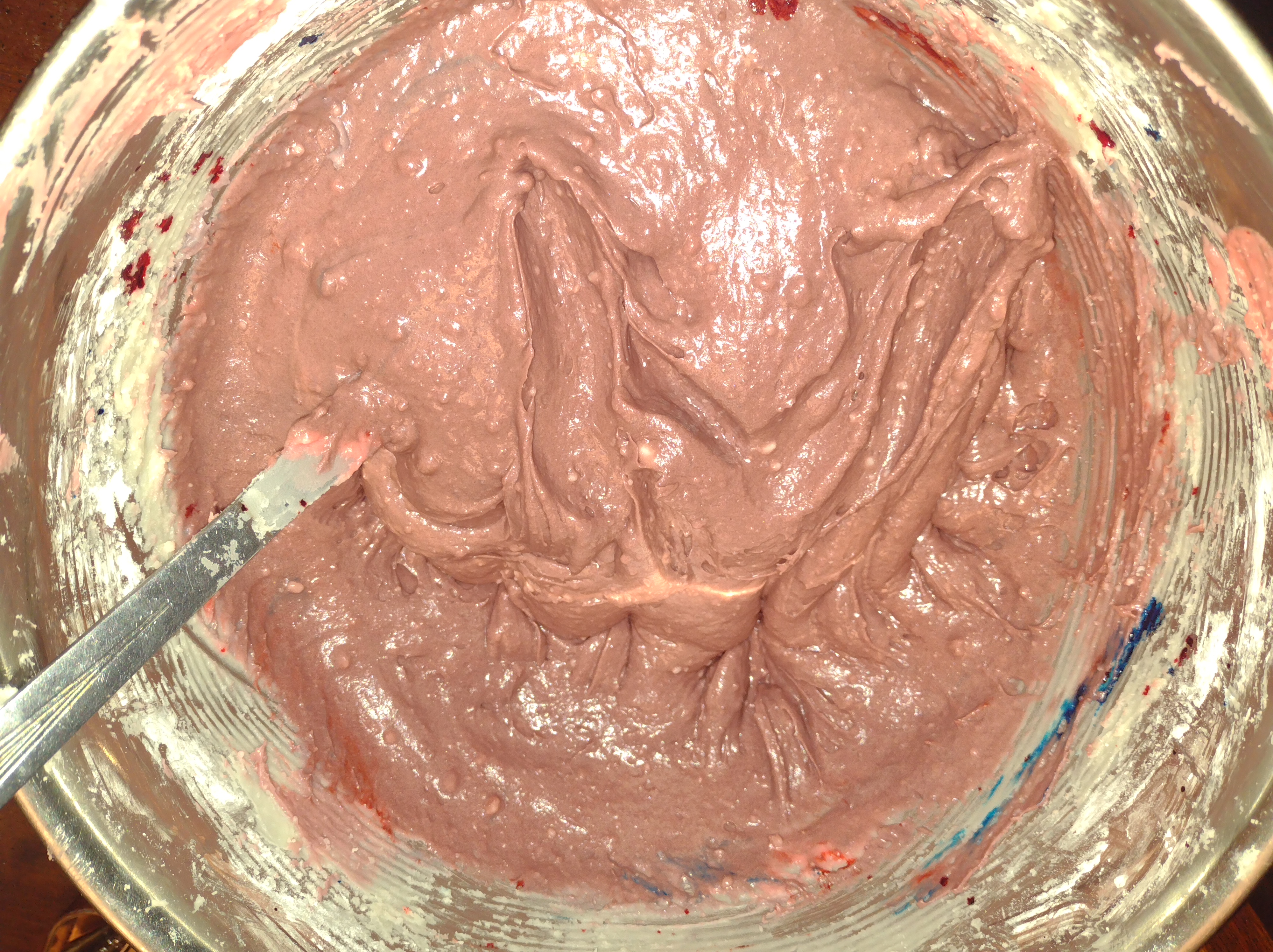 I whipped up my grandma’s old applesauce cake recipe and started on hand mixing cream cheese frosting. Everything was going so well until it was time to make the pink.